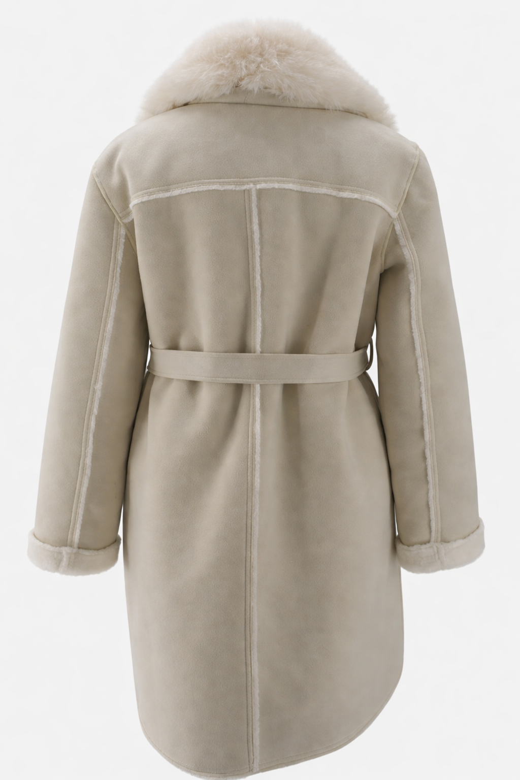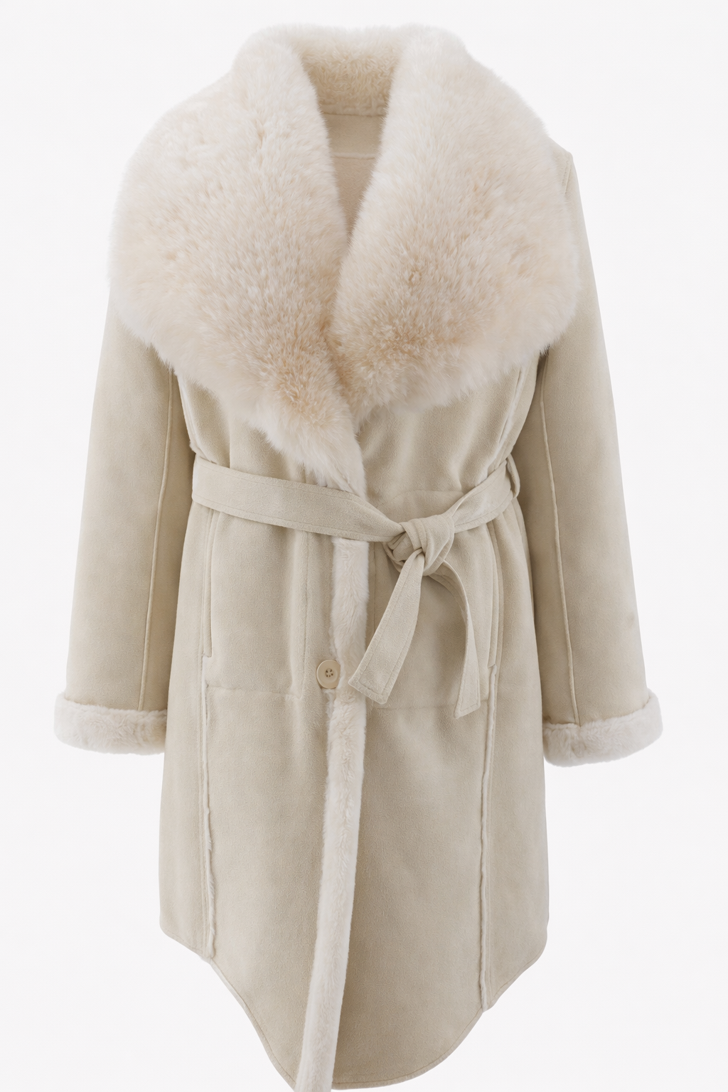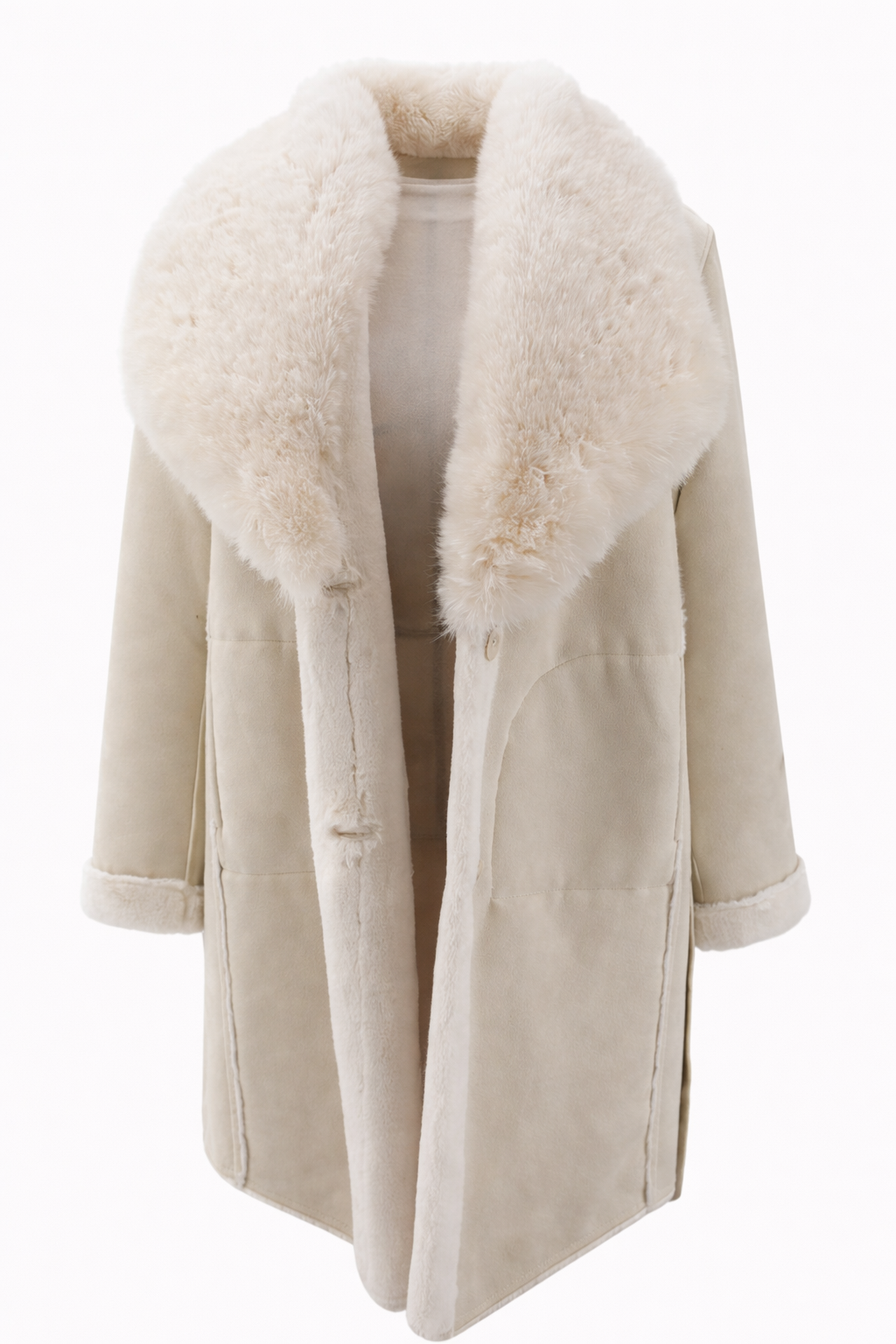 Cuello amplio de pelo suave, envolvente y elegante, que eleva el abrigo a una categoría claramente couture.