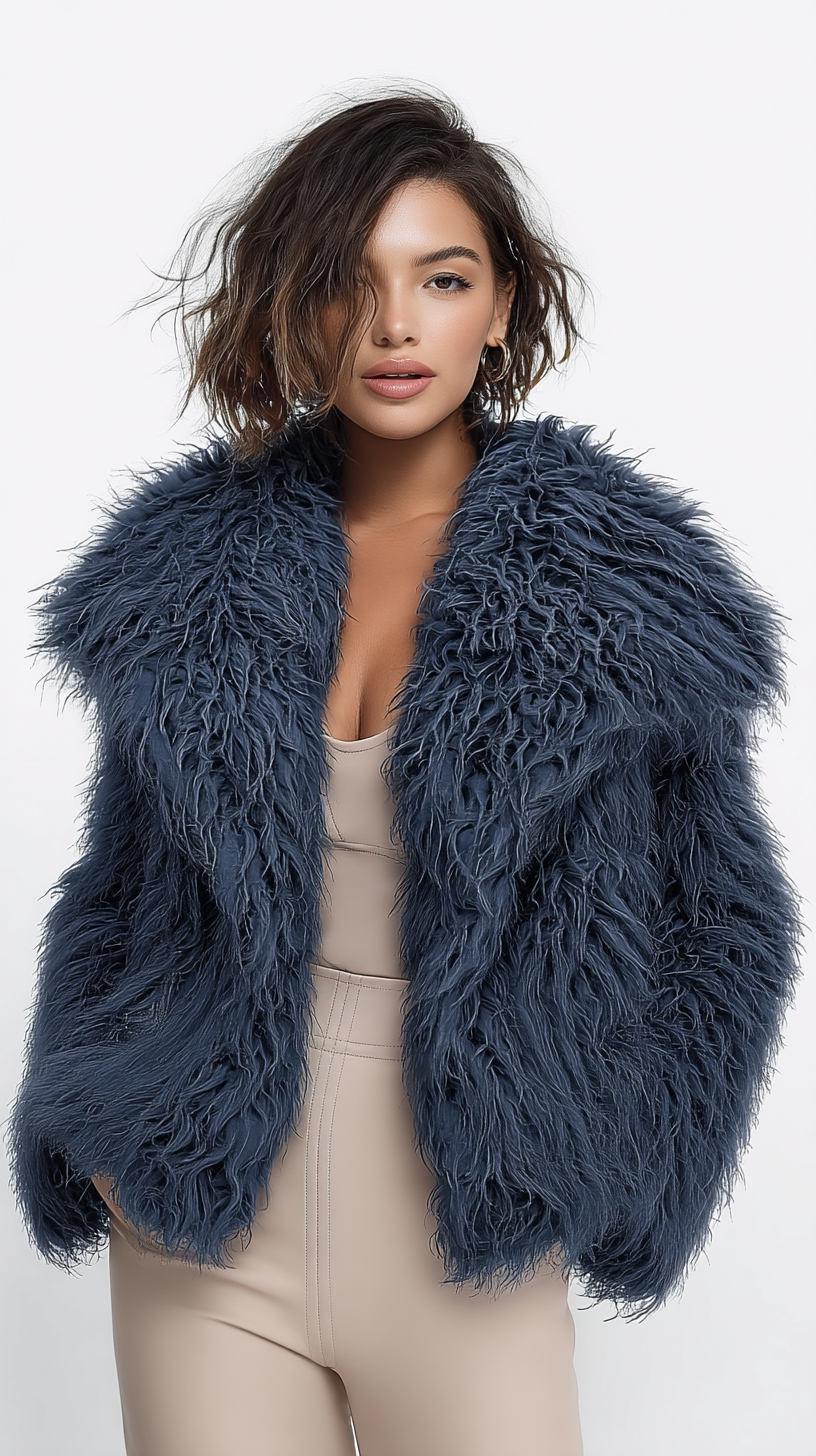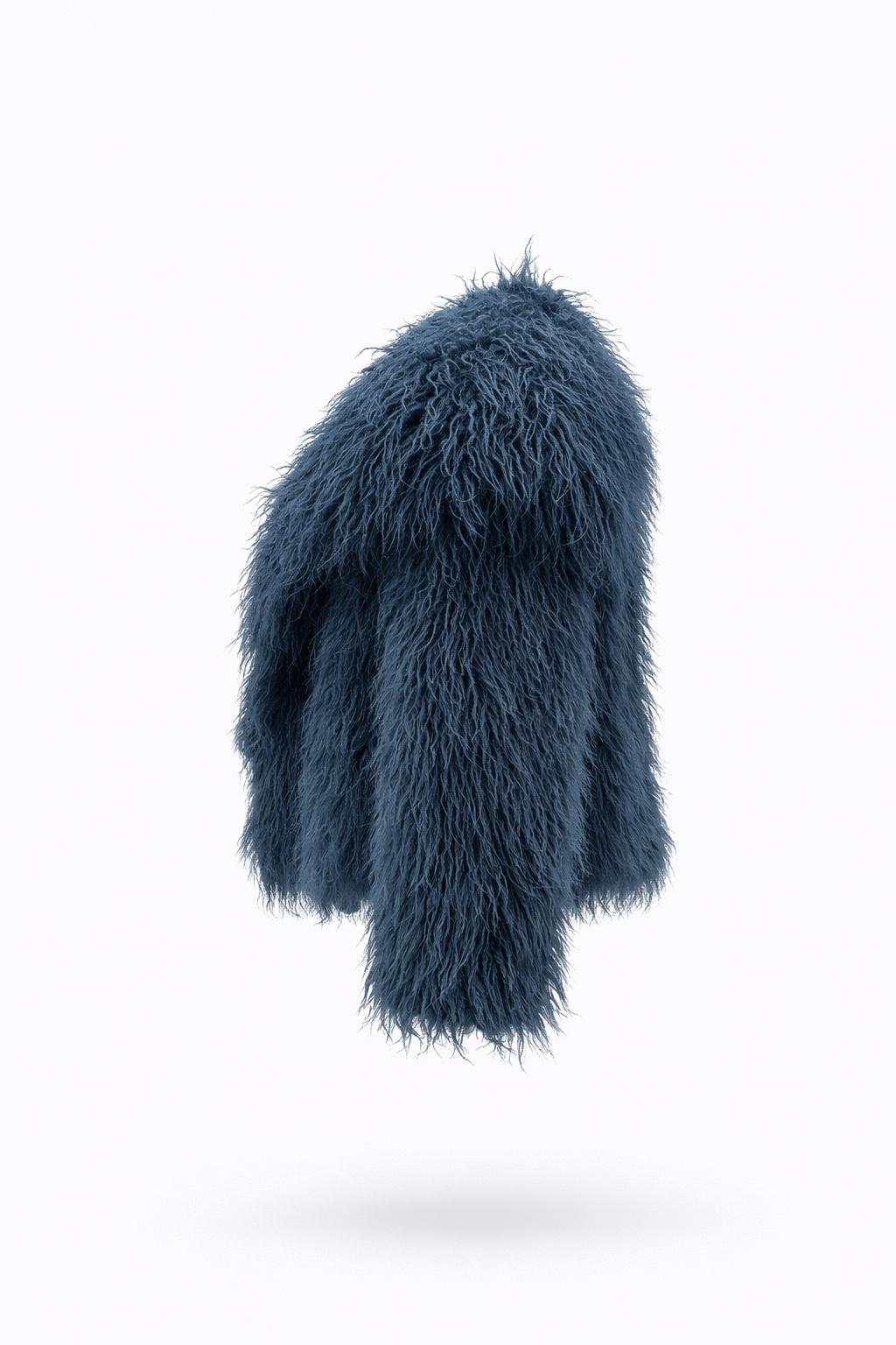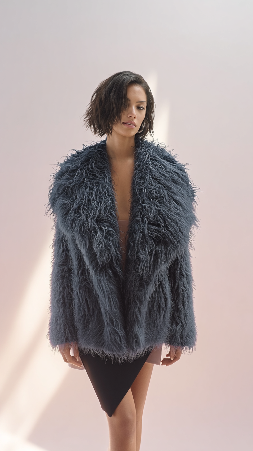 Diseñado para la mujer que entiende su presencia como una forma de arte, su acabado en ecopelo shaggy de fibra larga crea un efecto de “movimiento líquido” al caminar: dinámico, sensual y elegante.