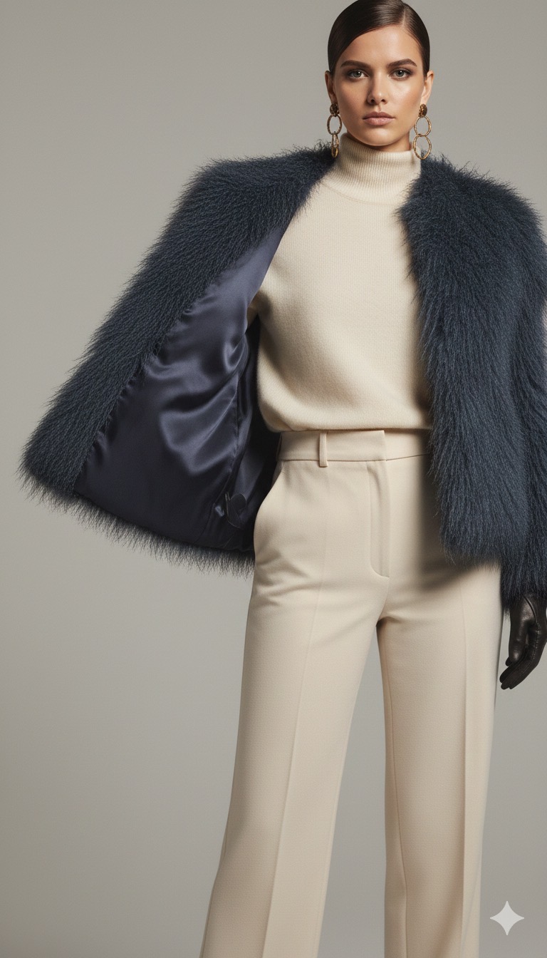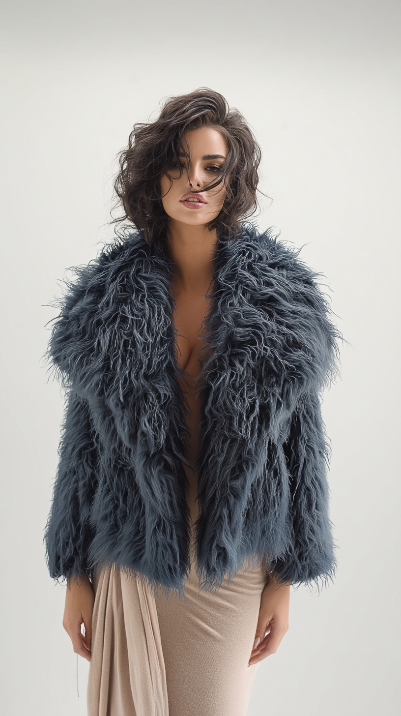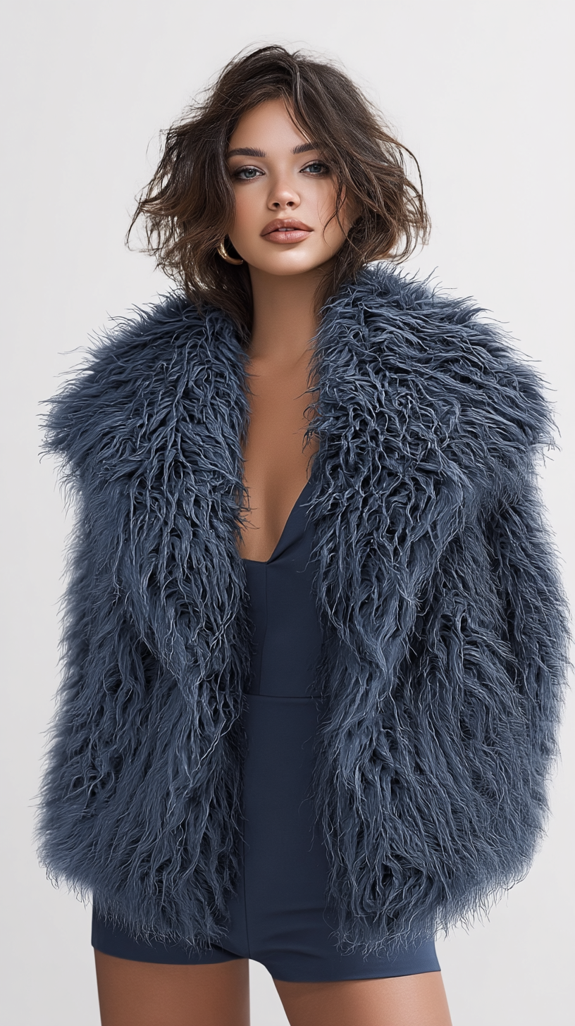 Diseñado para la mujer que entiende su presencia como una forma de arte, su acabado en ecopelo shaggy de fibra larga crea un efecto de “movimiento líquido” al caminar: dinámico, sensual y elegante.