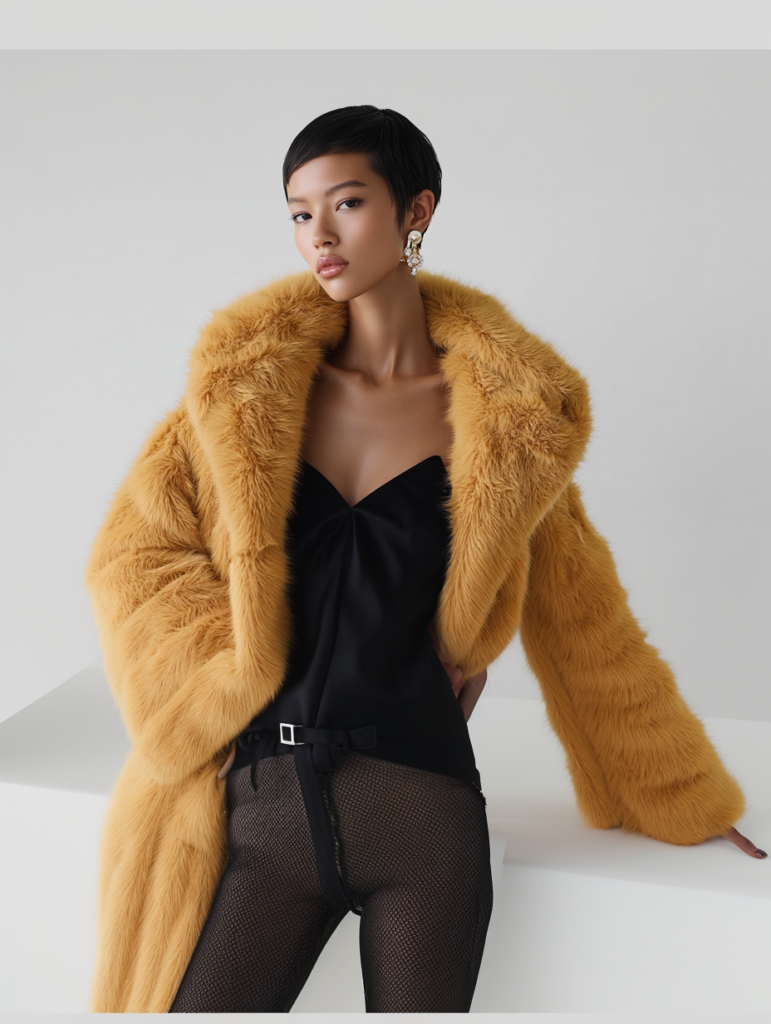 Abrigo midi de ecopelo premium en tono Saffron Gold, un mostaza cálido y sofisticado. Su volumen envolvente y textura densa aportan presencia, carácter y estilo inmediato a cualquier conjunto, manteniendo una estética elegante y atemporal.
