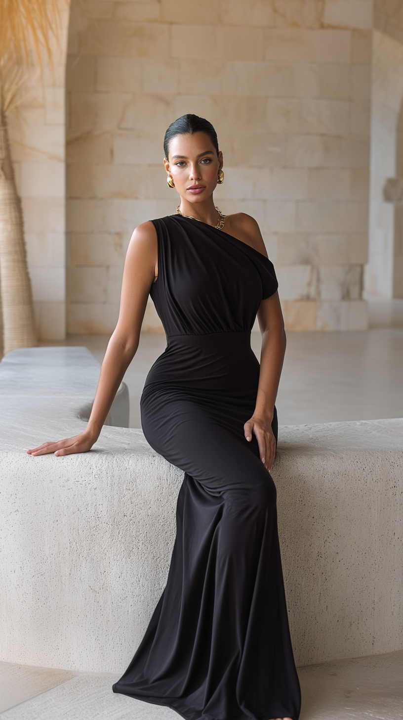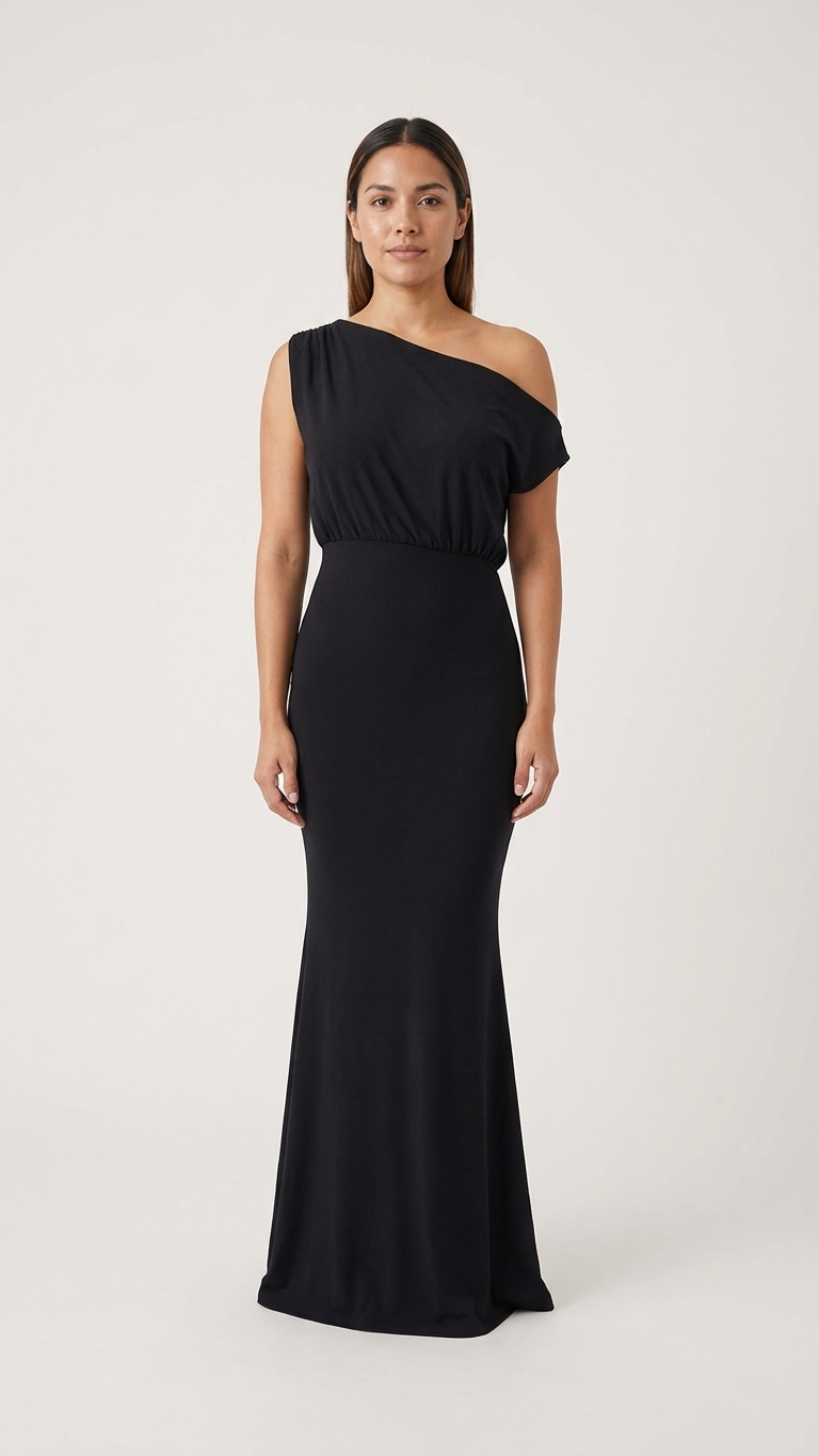 Escote Barco Asimétrico: Un diseño que se desliza por los hombros de forma natural. Esta asimetría orgánica resalta la línea de la clavícula y enmarca el rostro con una autoridad sofisticada.