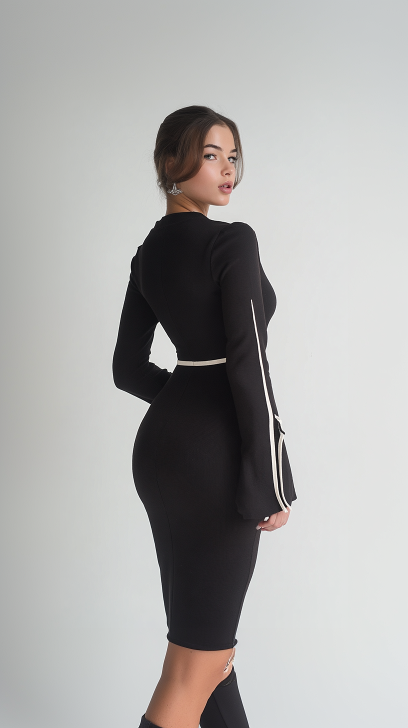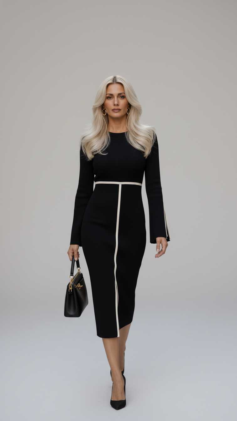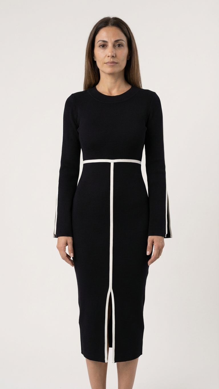 Arquitectura de Líneas: Una franja horizontal en la cintura bloquea la mirada, mientras que una línea vertical recorre el eje central de la falda, creando un efecto de alargamiento del tren inferior.