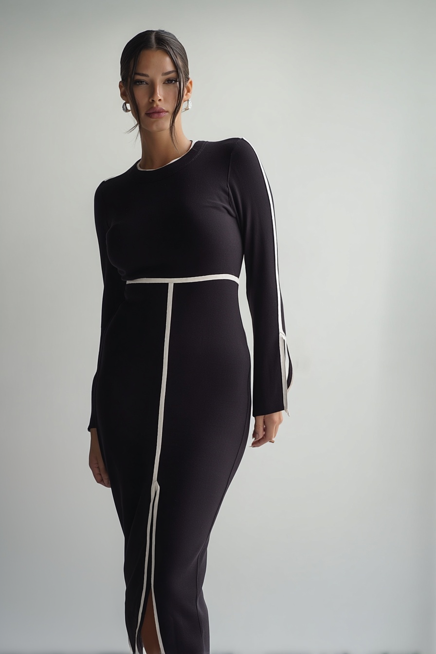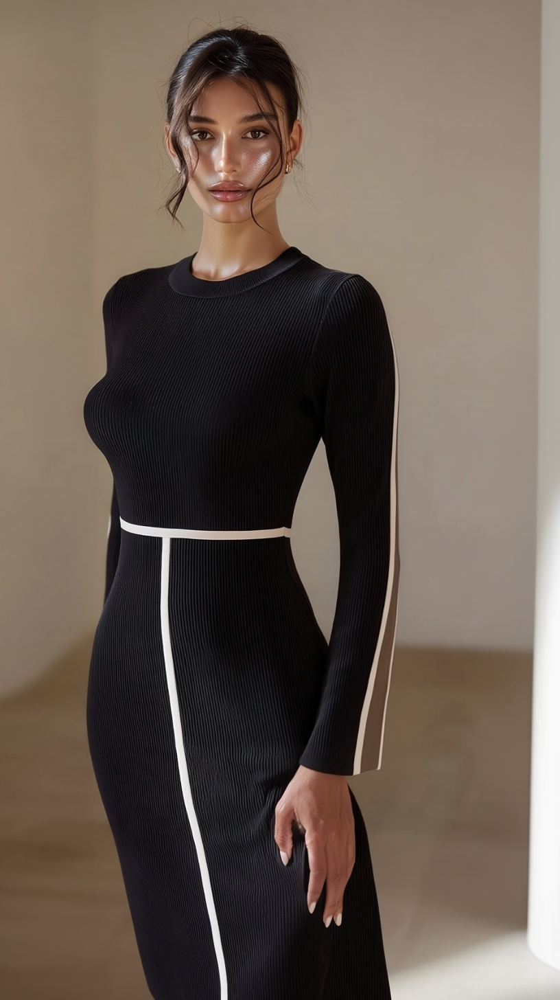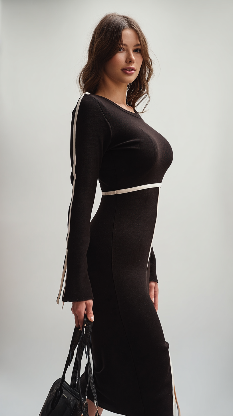 Arquitectura de Líneas: Una franja horizontal en la cintura bloquea la mirada, mientras que una línea vertical recorre el eje central de la falda, creando un efecto de alargamiento del tren inferior.