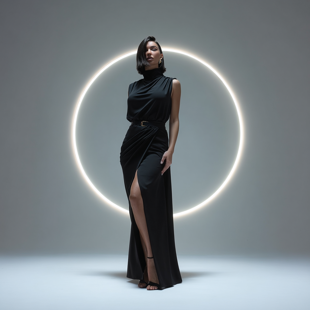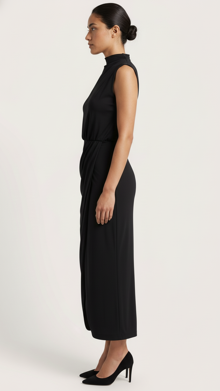 Vestido maxi de alta sofisticación con cuello levemente subido y diseño de hombros fruncidos. Estructura de «doble piel» (totalmente forrado) con cierre envolvente lateral y cinturón a tono. Ingeniería textil diseñada para eventos de impacto y autoridad serena.