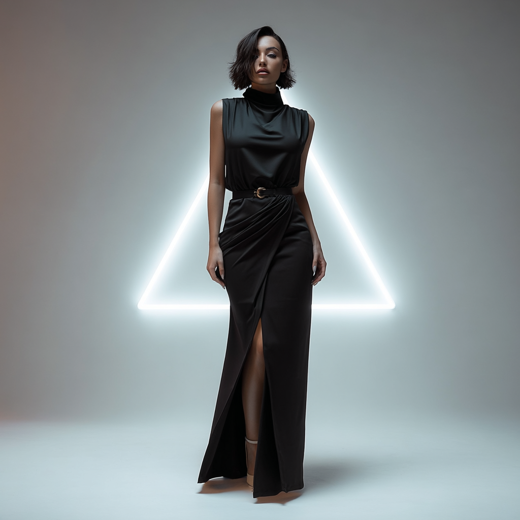 • Triángulo Invertido: El volumen de la falda maxi y la abertura lateral equilibran visualmente la amplitud de hombros.