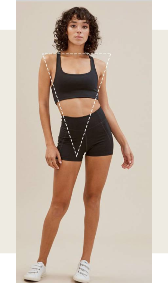 Normalmente, las caderas de una mujer en forma de triángulo invertido son notablemente más estrechas en comparación con los hombros anchos (por lo tanto, la combinación es lo que hace que la forma del cuerpo parezca un triángulo invertido).