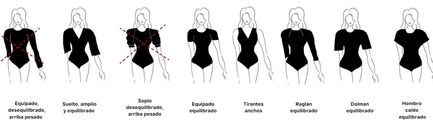 Evita cualquier adorno en los hombros, hombros acolchados, mangas abullonadas, mangas Julieta, mangas tulipán, o cualquier manga con volumen en el hombro.