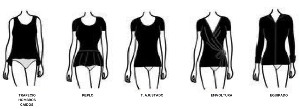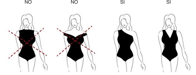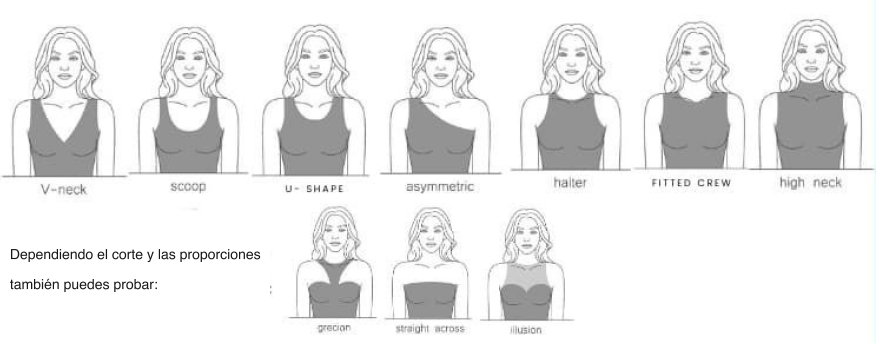 Evitar generalmente los escote barco, escote capucha, escote Sabrina, escote cuadrado, escote batear y hombros abiertos