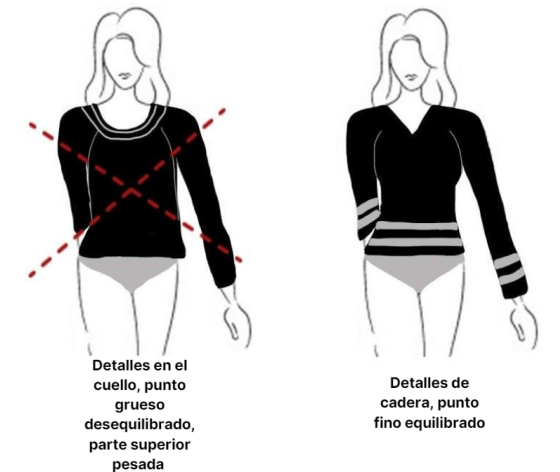 • Evita patrones como rayas horizontales y jerséis gruesos que agreguen volumen a la línea de tu hombro.