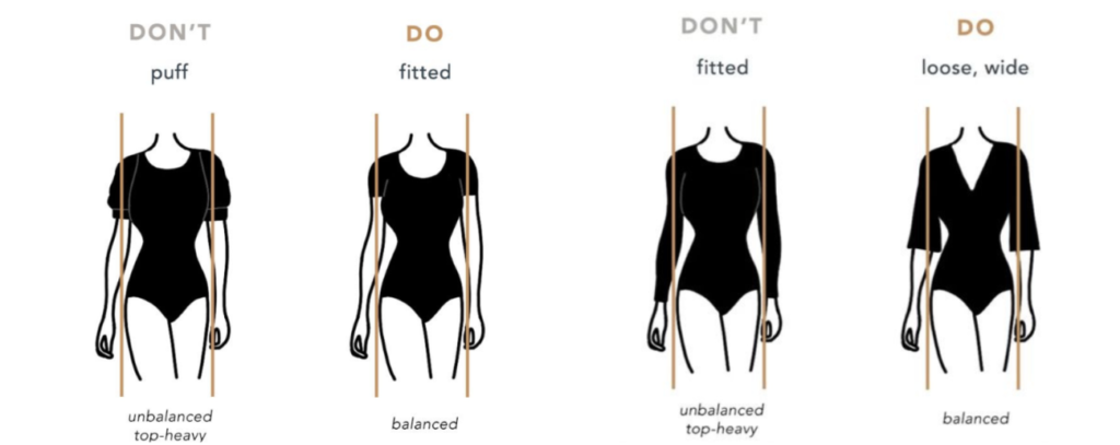 Las mangas ajustadas pueden ir bien para tu silueta, pero tendrás que tener cuidado si hay demasiado volumen en la costura del hombro.